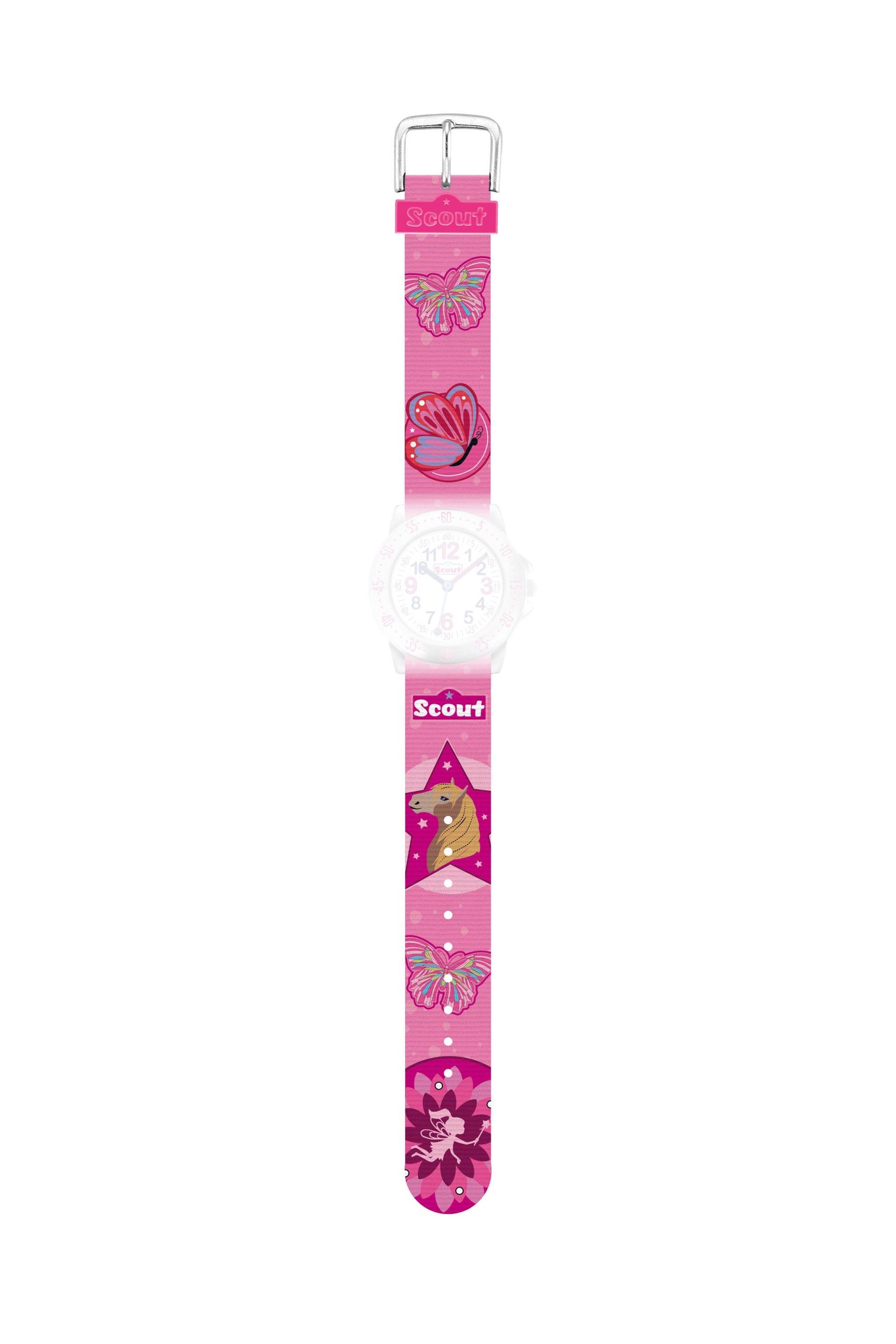Scout Textiluhrband Action Girls pink bunt mit Schmetterling . Das weiche Textilmaterial liegt angenehm am Arm, die Schließe besteht aus Edelstahl. Waschbar bis 30°C in der Waschmaschine.