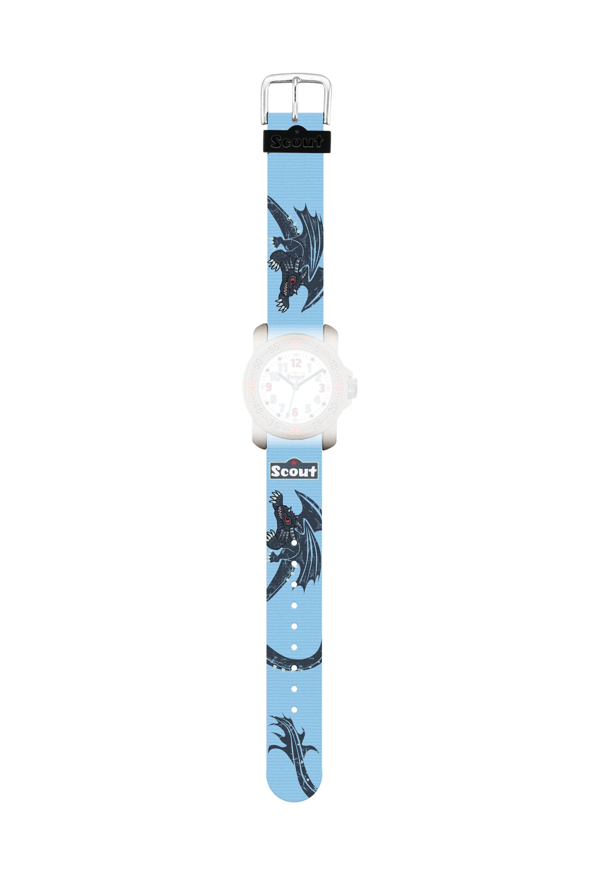 Scout Textilband hellblau aus der Serie Black Dragon Motiv Drache. Das weiche und anschmiegsame Textilmaterial besitzt eine robuste Edelstahlschließe und kann bei 30°C in der Waschmaschine gewaschen werden.