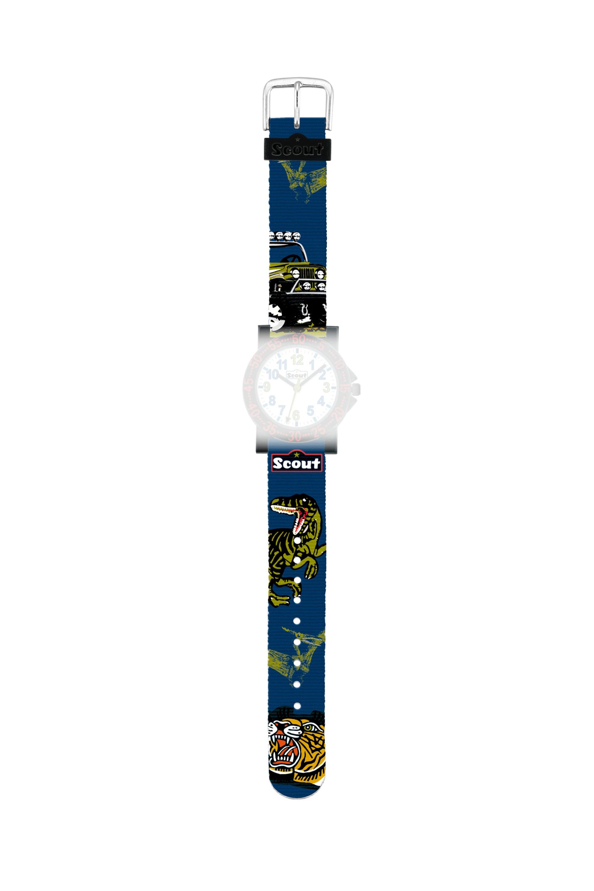 Scout Textilband blau mit Motiven Dino, Tiger und Jeep. Das sehr weiche und anschmiegsame Textilband kann bei 30°C in der Waschmaschine gewaschen werden.Die robuste Schließe ist aus Edelstahl.