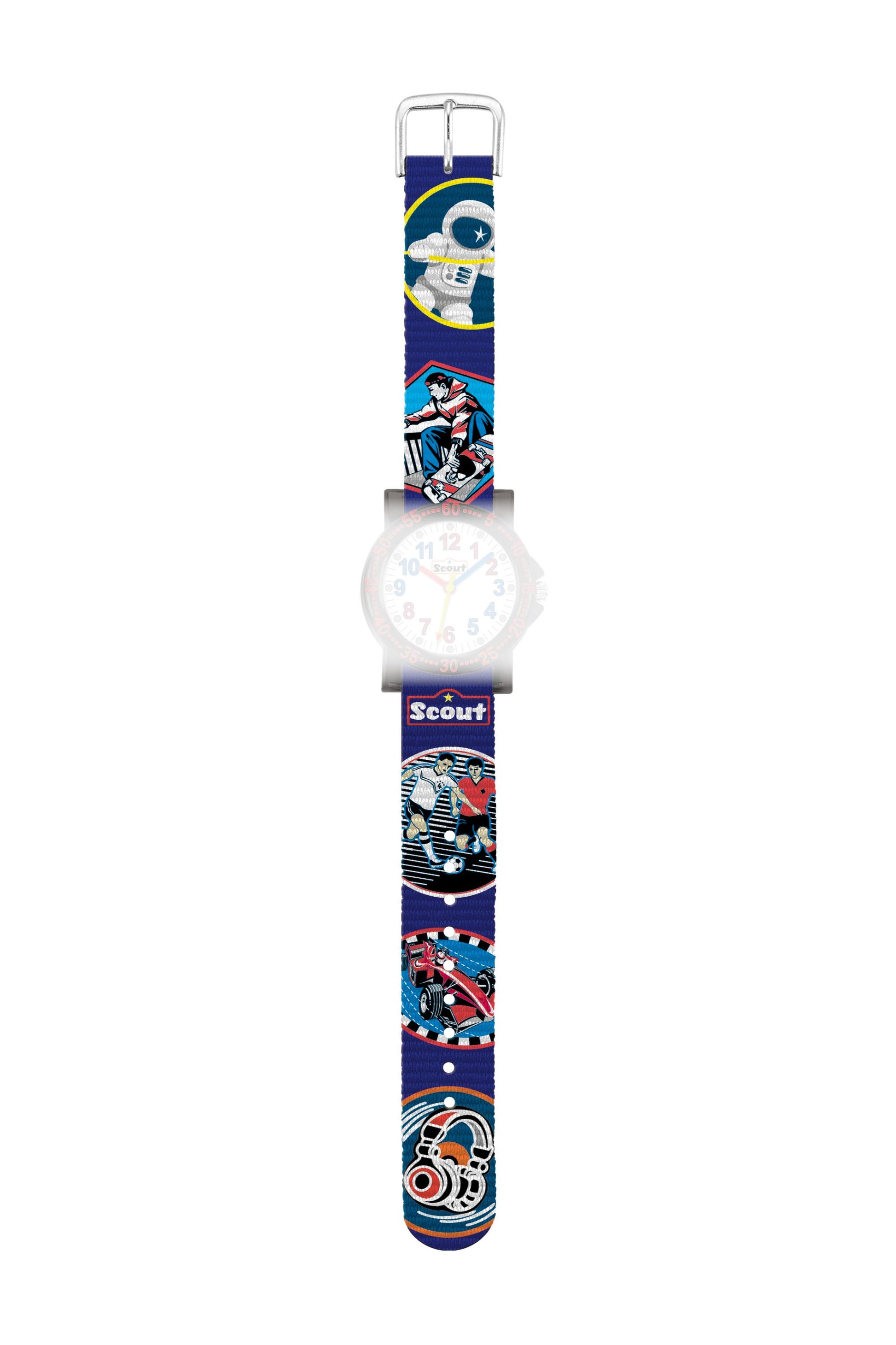 Scout Textilband bunt mit Motiven Kopfhörer,Fußball und Rennwagen.Das weiche Uhrband kann bis 30°C in der Waschmaschine gewaschen werden und verfügt über eine robuste Schließe aus Edelstahl.