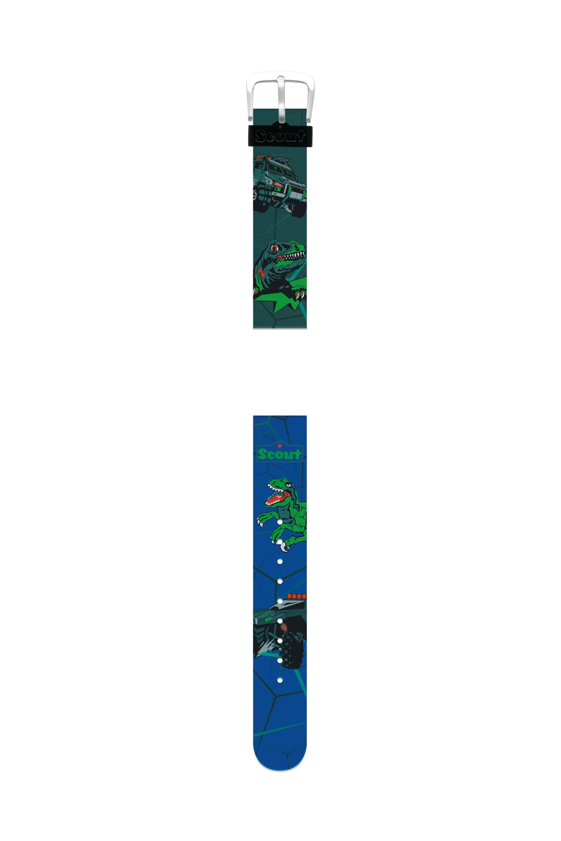 Scout Textilband grün/blau Serie Action Boys Motiv Dino. Das sehr weiche und anschmiegsame Textilband kann bei 30°C in der Waschmaschine gewaschen werden. Die robuste Schließe ist aus Edelstahl.