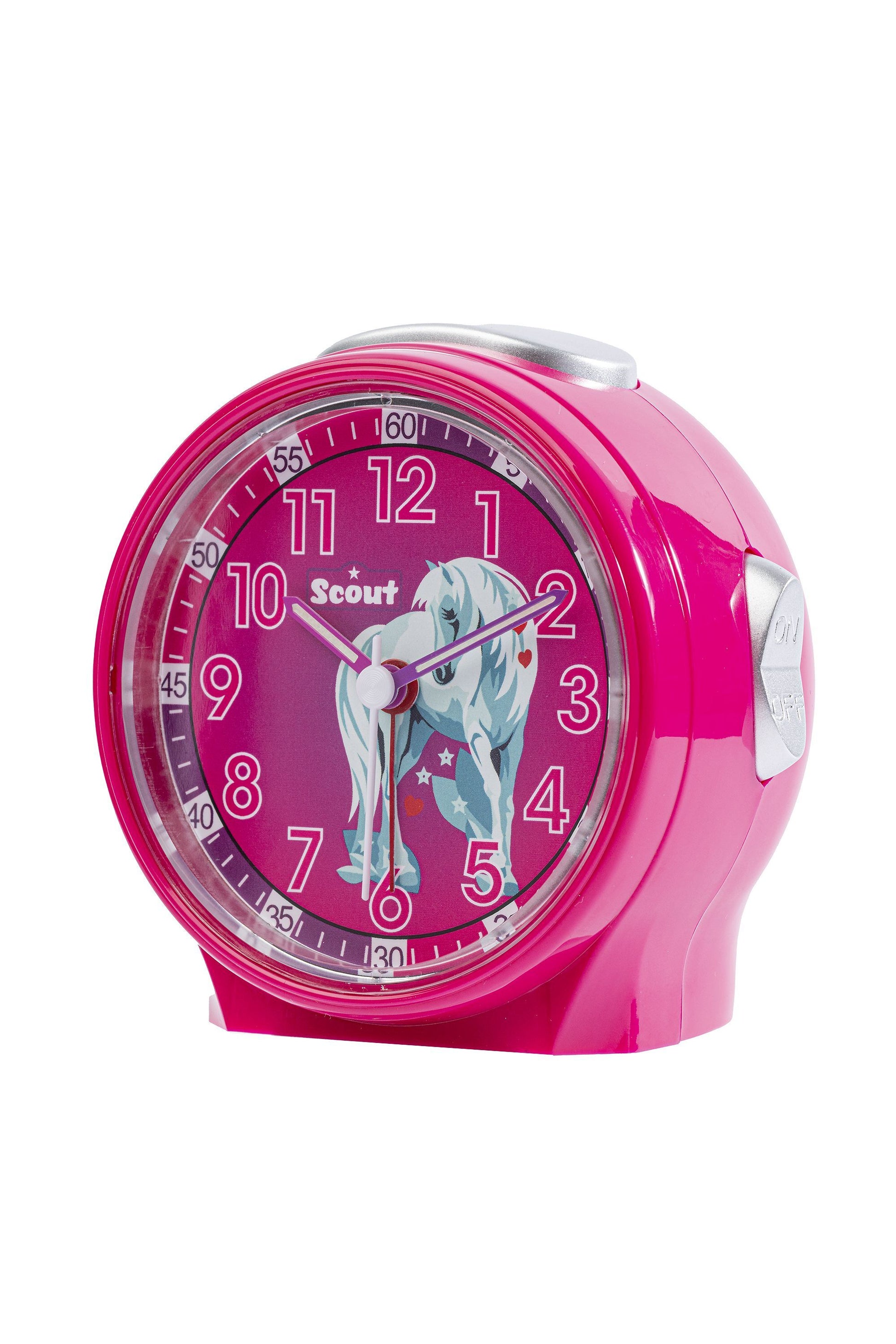 Scout - Kinder-Wecker der Serie "White Unicorn" mit pinkem Gehäuse, Lernziffernblatt, Einhorn-Motiv und Beep-Beep Funktion mit Schlummer- und Lichttaste