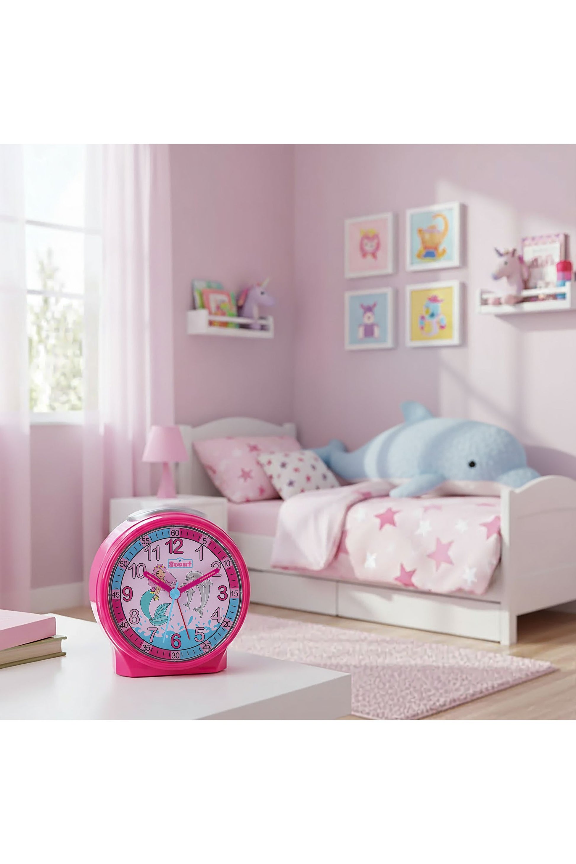 Scout Wecker analog mit pinkem Gehäuse, Lernziffenrblatt und süßen Motiven aus der Wasserwelt