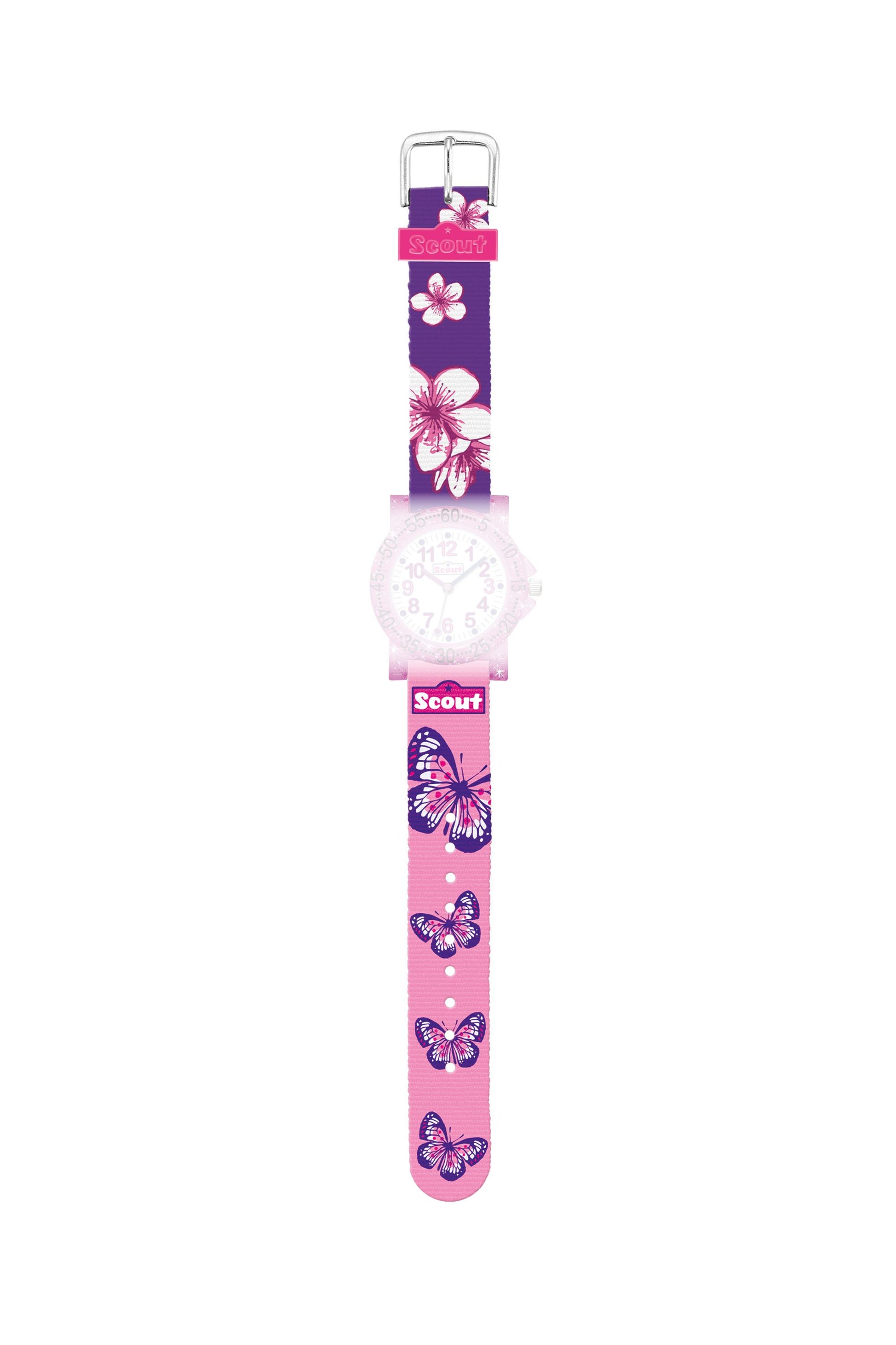Scout - Die Scout-Motive auf dem anschmiegsamen Textil-Uhrband entsprechen denen der Schulranzen-Modelle 'Asia Flower' und 'Cool Girl'. Die Schließe ist aus Edelstahl gefertigt und das Band kann bis 30°C in der Waschmaschine gewaschen werden.