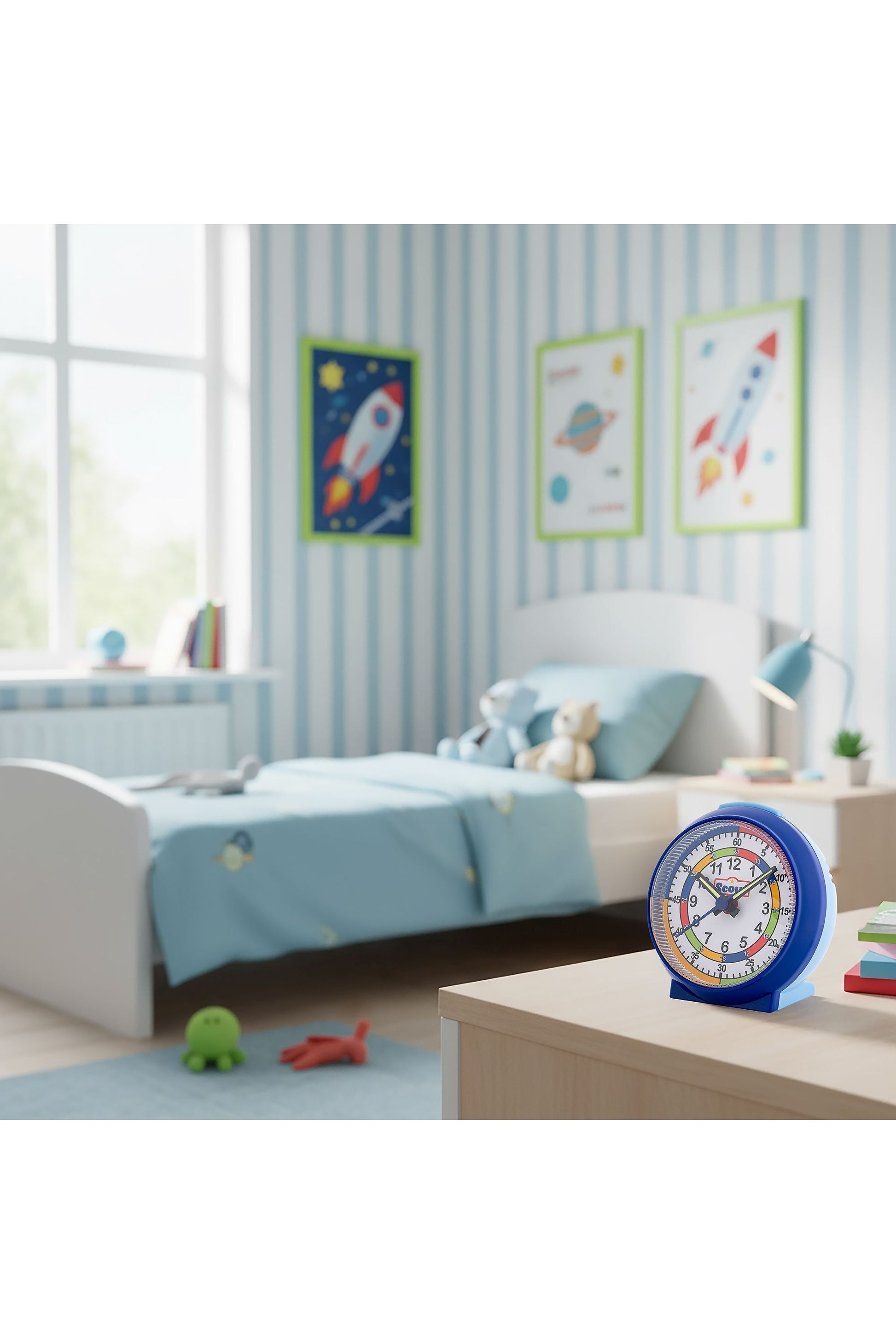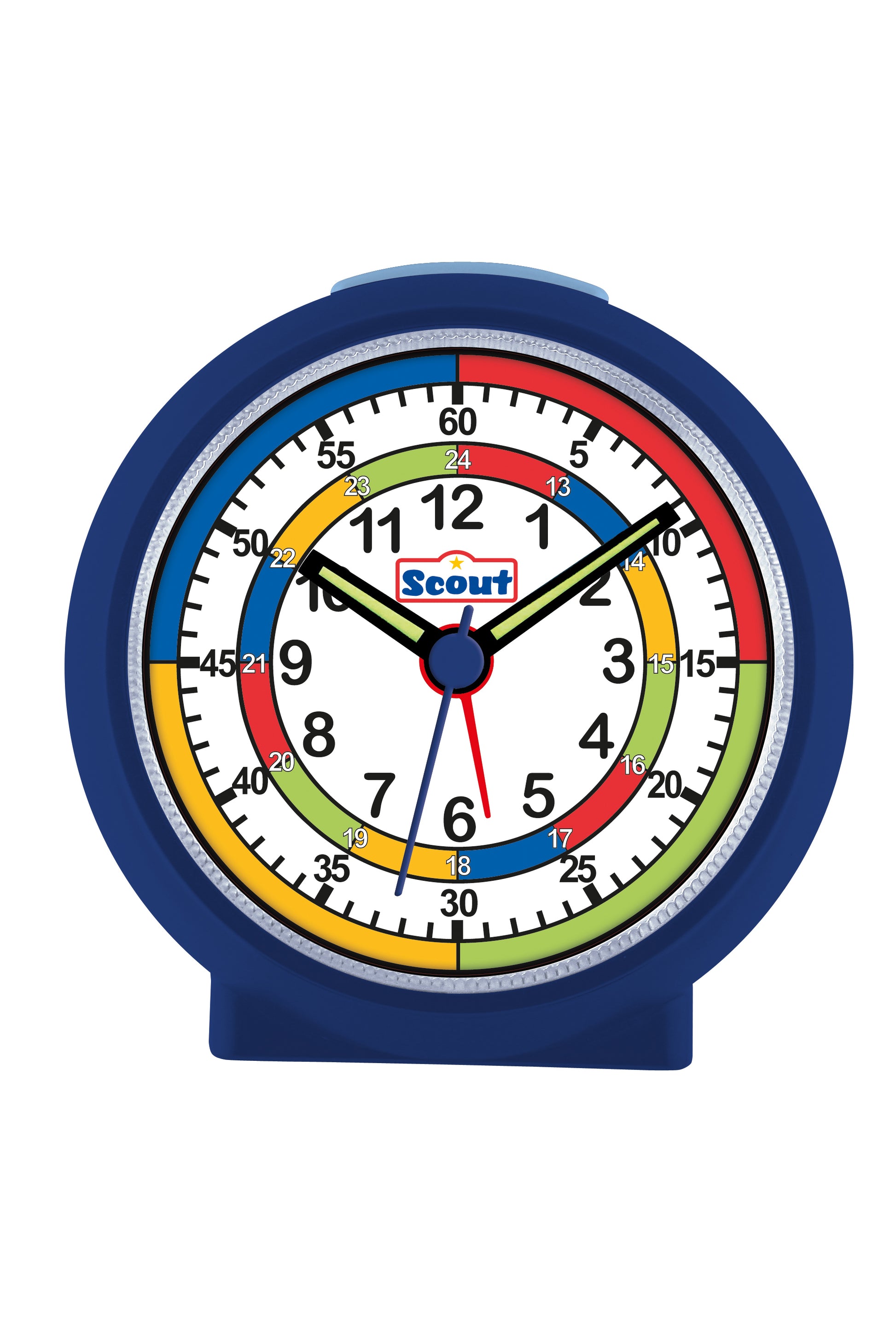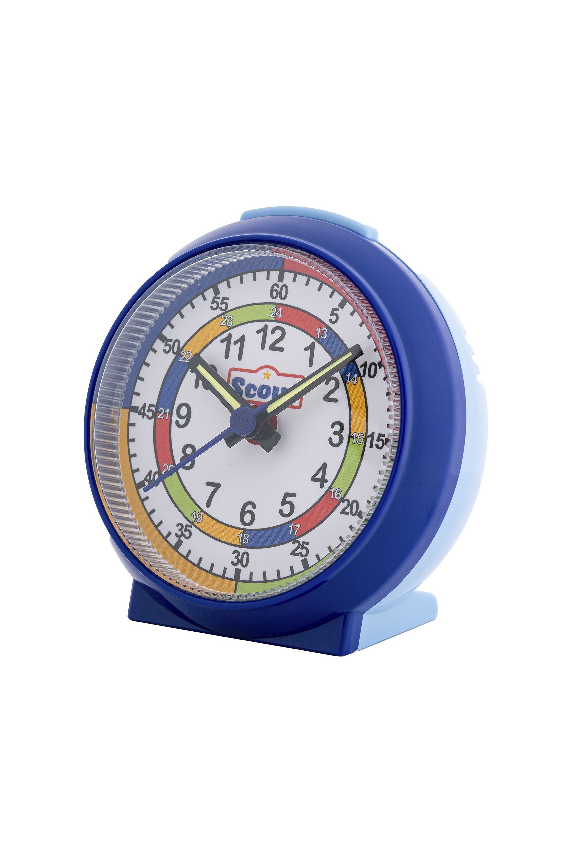 Scout Wecker analog mit blauem Gehäuse und buntem Lernziffernblatt für Kinder