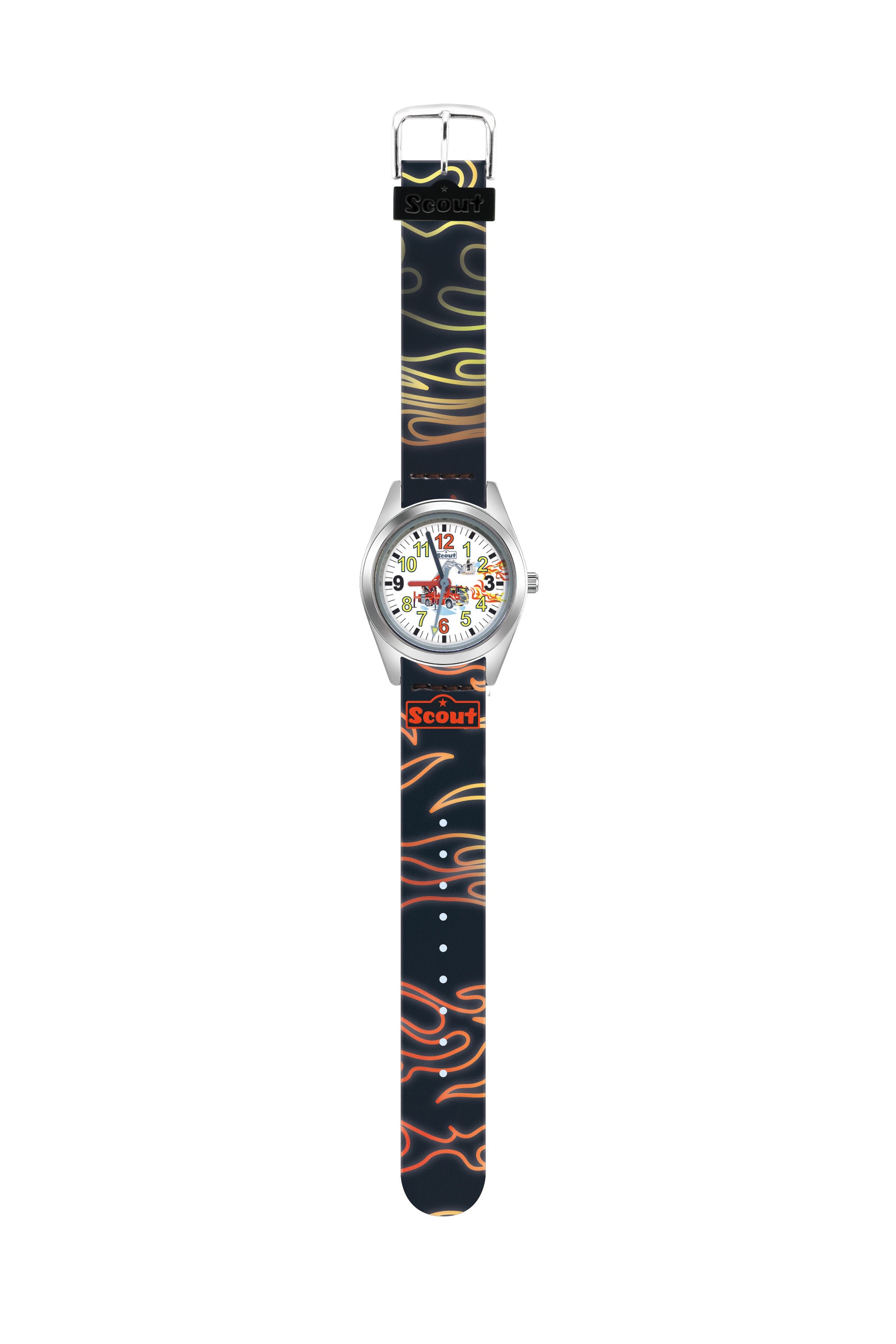 Scout - Kinder-Uhr aus der Serie "Classic" wasserdicht bis 5bar mit mehrfarbigem Kunstlederband, Flammen und Feuerwehr-Motiven und Dornschließe