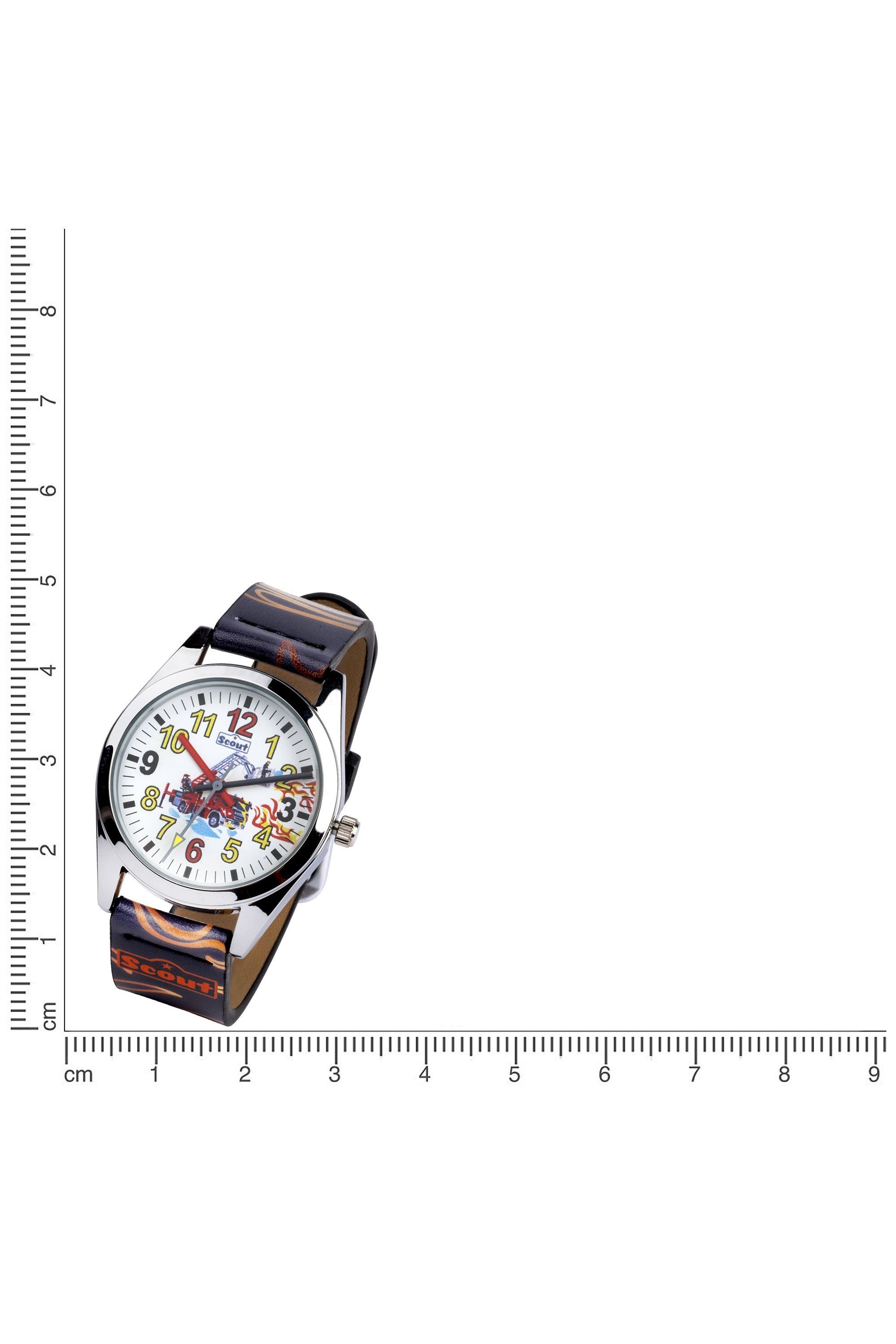 Scout Kinderuhr analog aus der Serie "Classic" mit mehrfarbigem Kunstlederband mit Flammen, Feuerwehr-Motiv und Quarzwerk