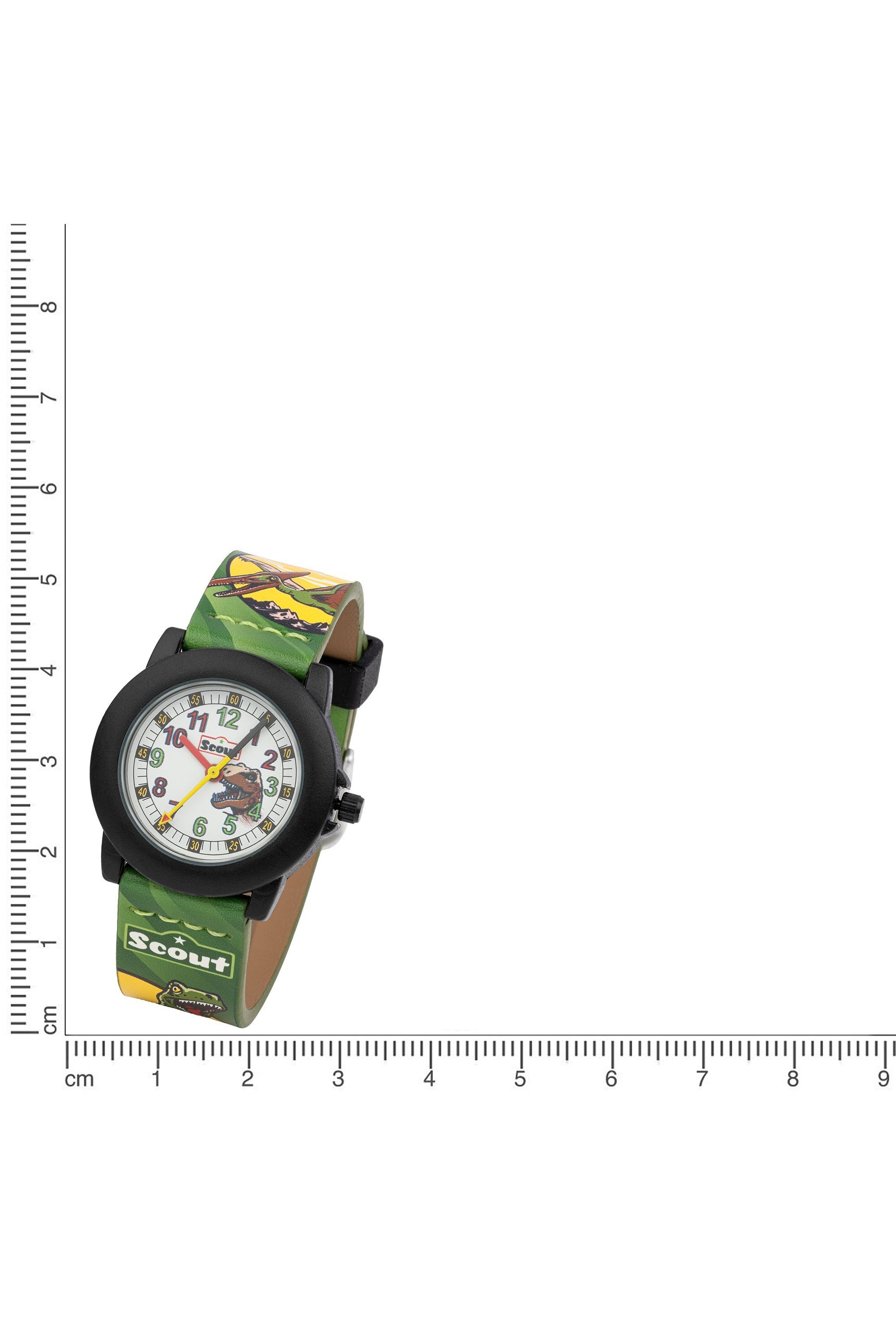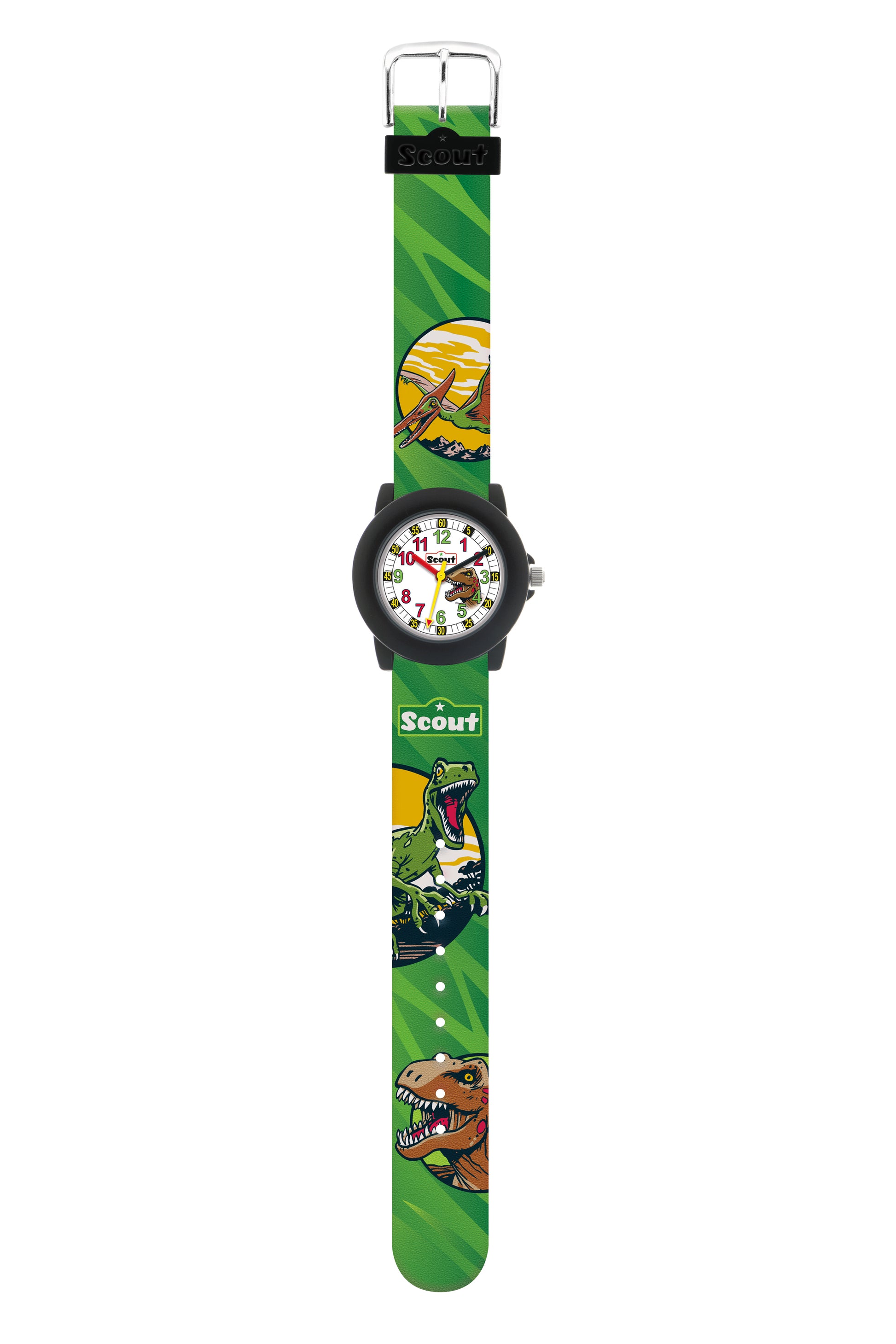 Scout Kinderuhr analog aus der Serie "Crystal" mit grünem Kunstlederband mit Dinosaurier-Motiven und Quarzwerk