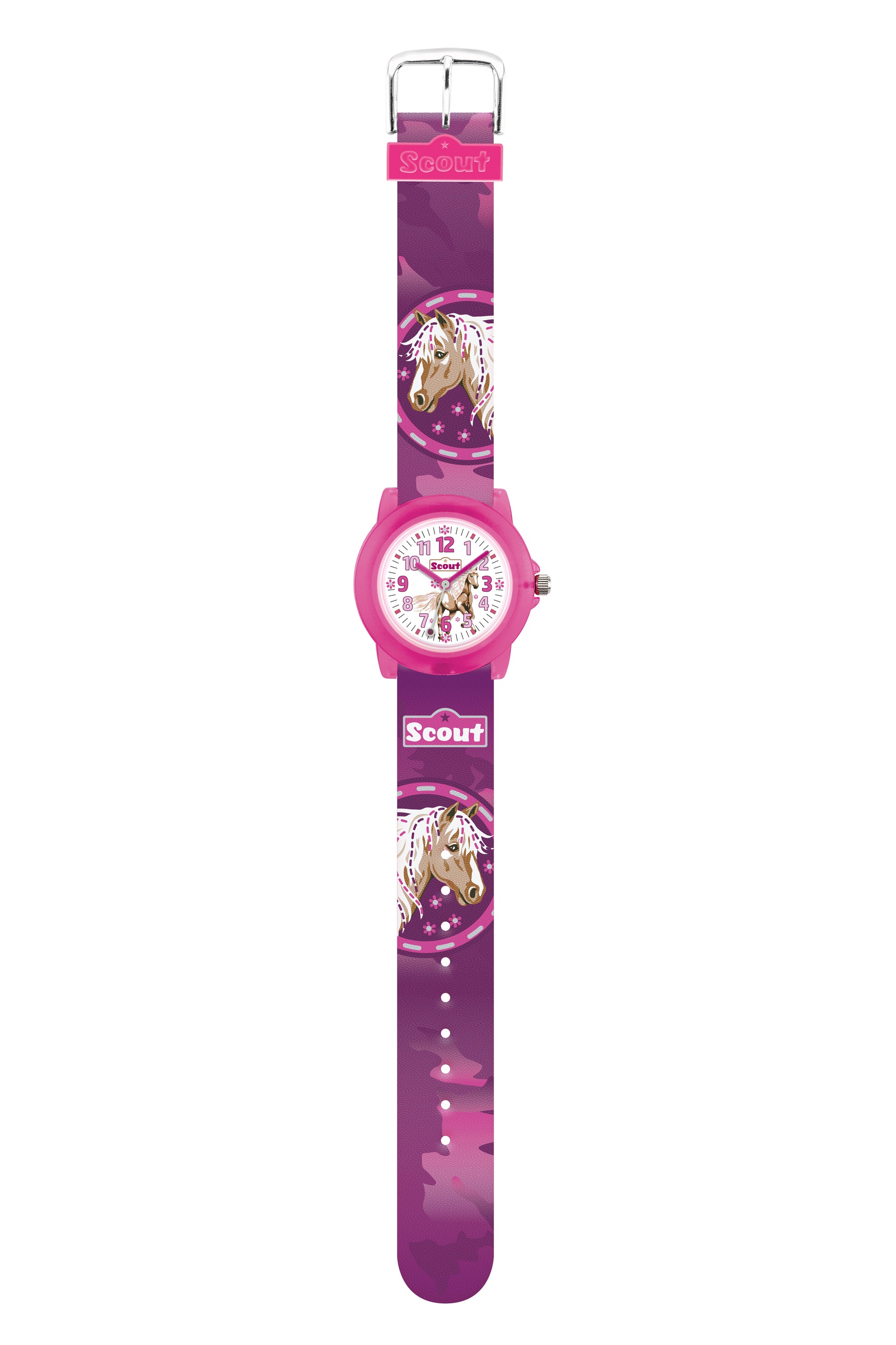 Scout Kinderuhr analog aus der Serie "Crystal" mit lila pinkem Kunstlederband, Pferde-Motiven und Quarzwerk