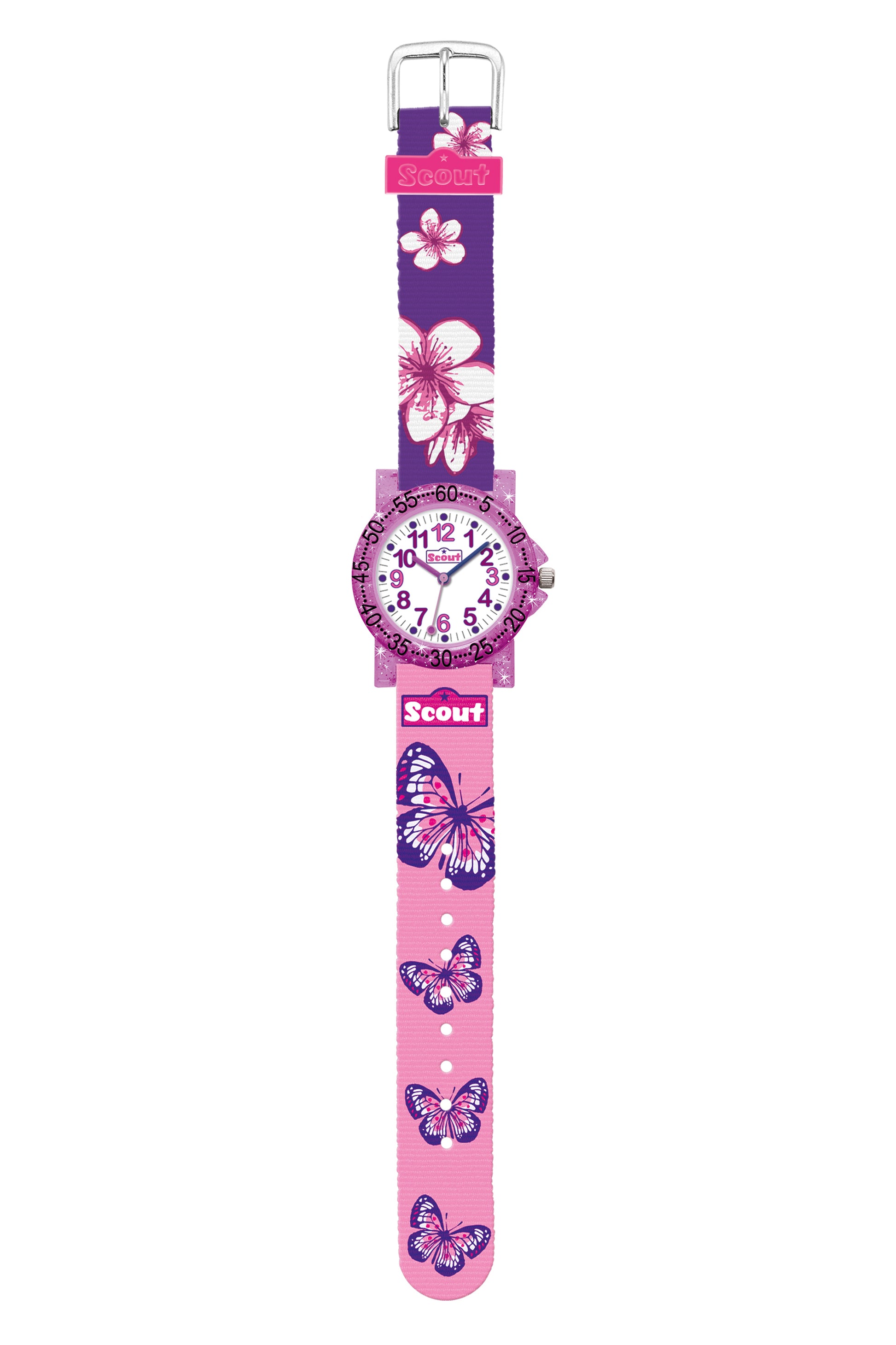 Scout Kinderuhr analog aus der Serie "The IT Collection" mit rosa lilanem Textilband, Schmetterling-Motiven und Quarzwerk